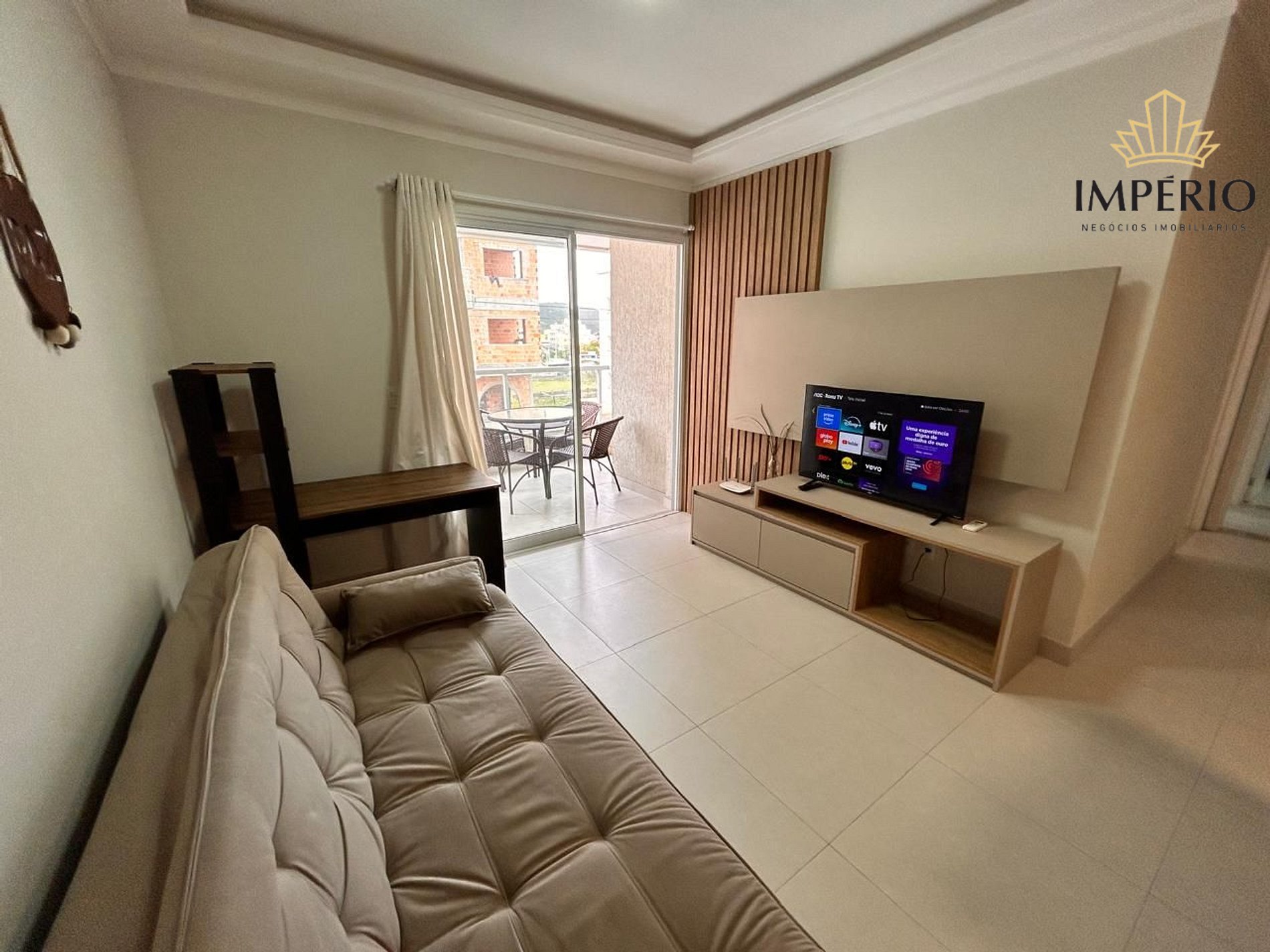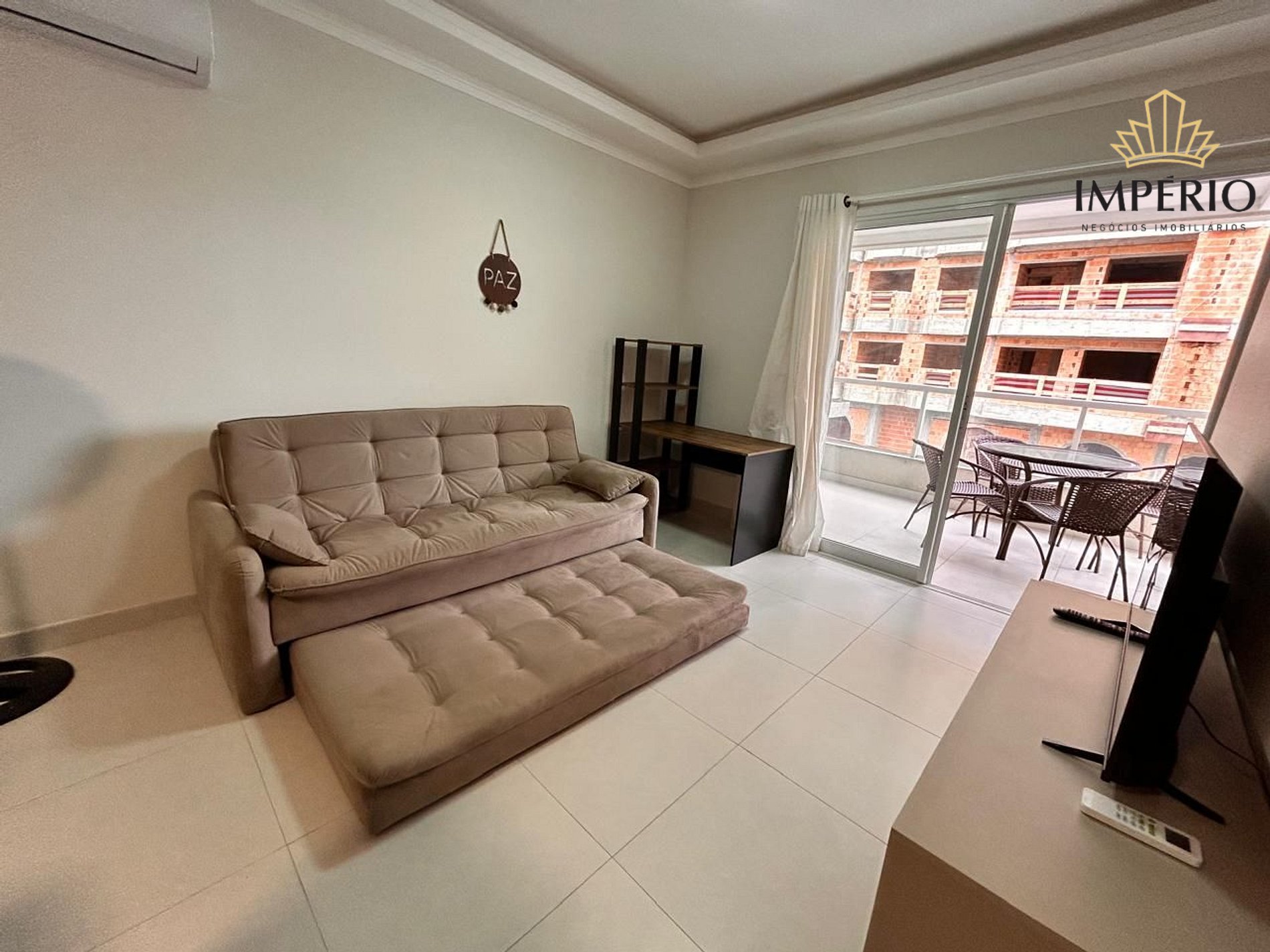 Sala de estar com sofá cama e Tv Smart;
