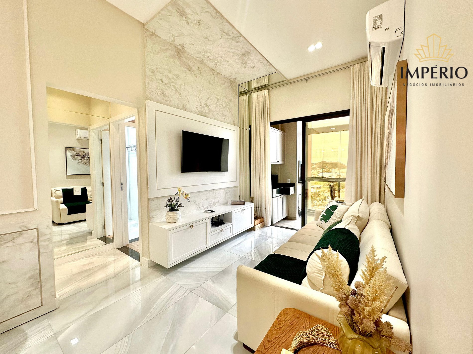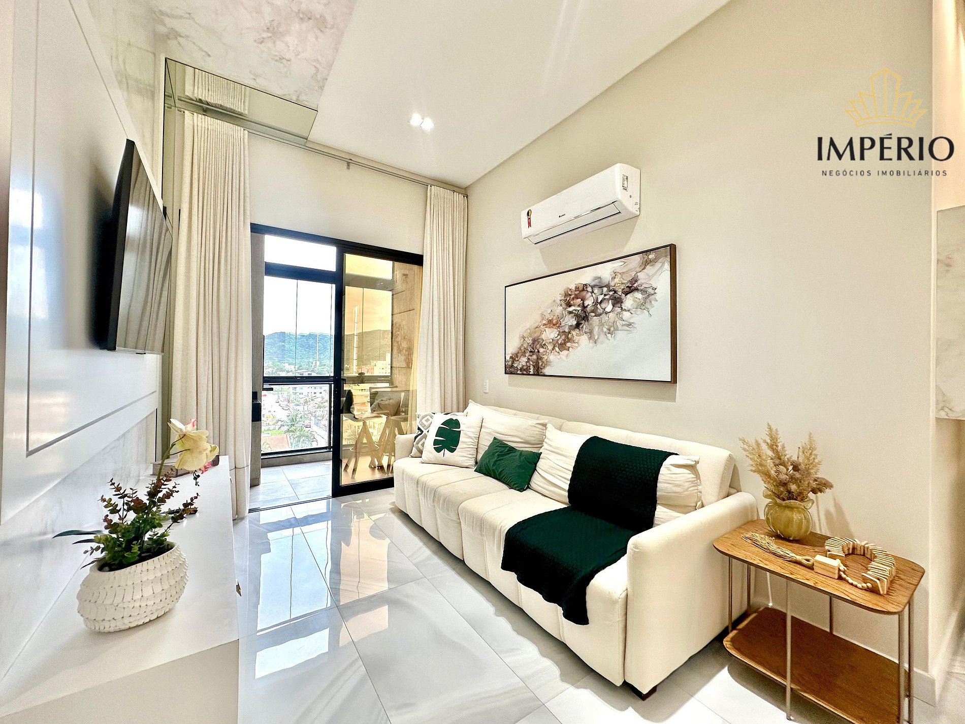 Sala de estar com sofá cama, TV smart e ar condicionado