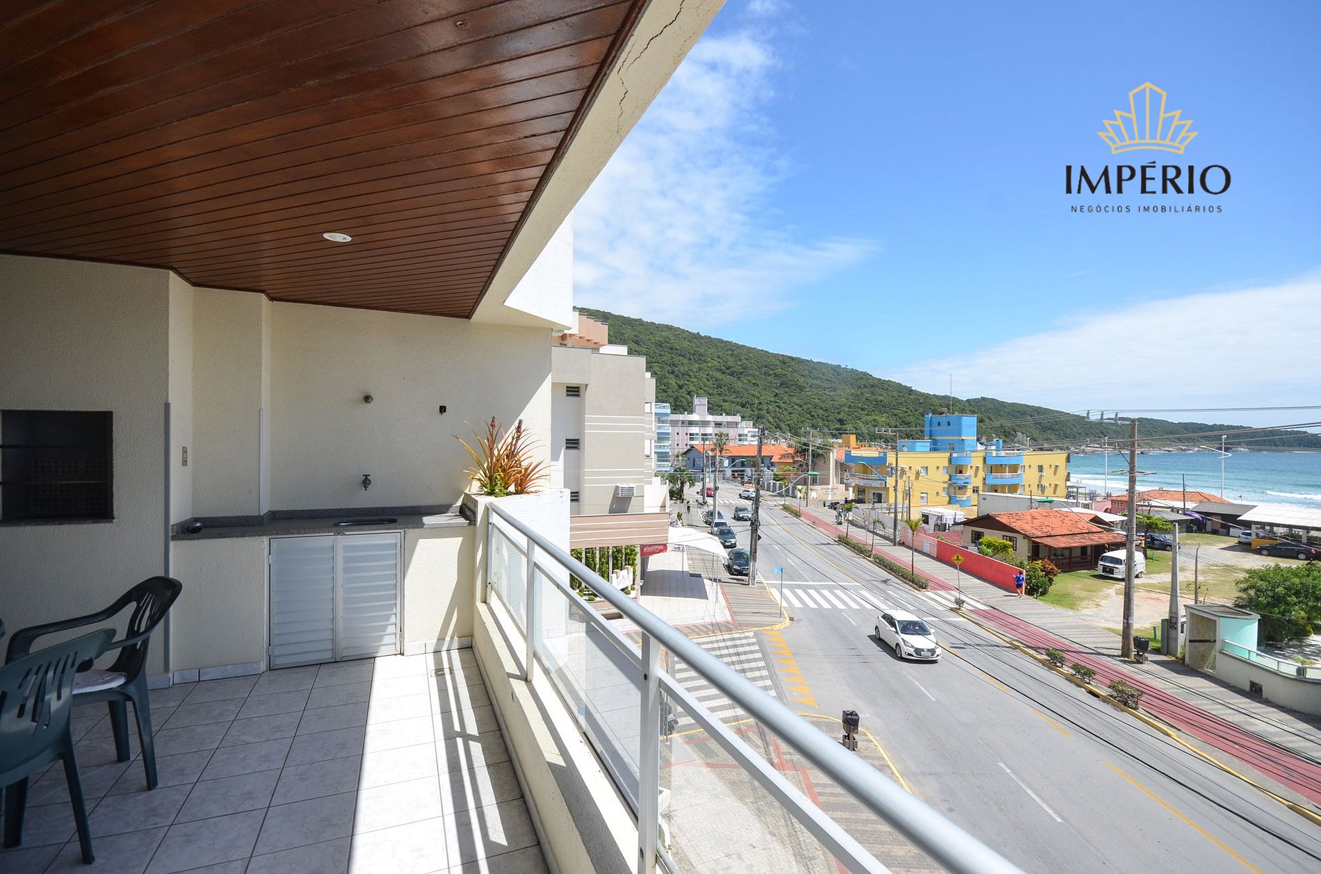 Sacada com churrasqueira e vista para o mar;
